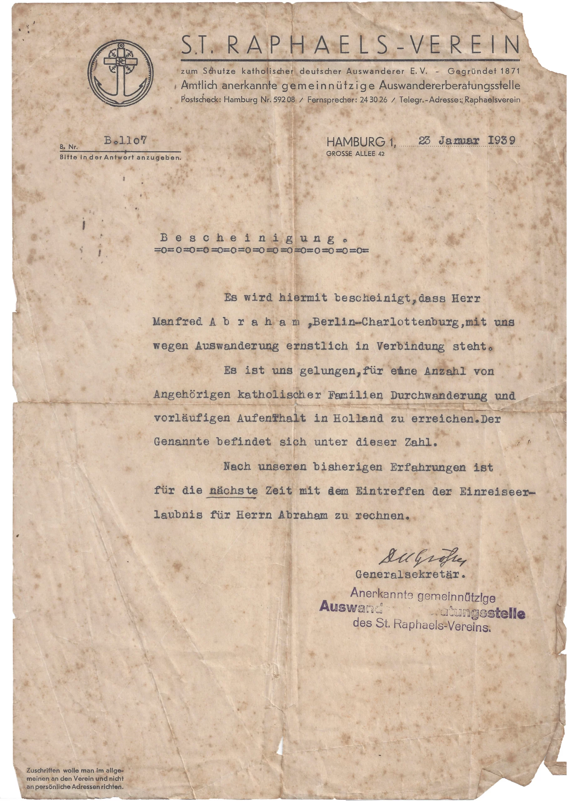 Eine Bescheinigung des St. Raphaels-Vereins rettete seinem jüdischen Onkel Manfred das Leben – davon ist Dr. Michael Abraham heute überzeugt. Um dem Tod im KZ zu entkommen, wurde Manfred Katholik. So konnte der katholische St. Raphaels-Verein die Ausreise der Familie von Berlin über Hamburg nach Brasilien organisieren: Ehefrau Anna und Sohn Karl fuhren mit dem Schiff direkt von Hamburg nach Rio de Janeiro, Manfred musste einen Umweg über die Niederlande nehmen und kam ein Jahr später ebenfalls in Rio an. Die Familienflucht erzählt Dr. Michael Abraham hier im Film.